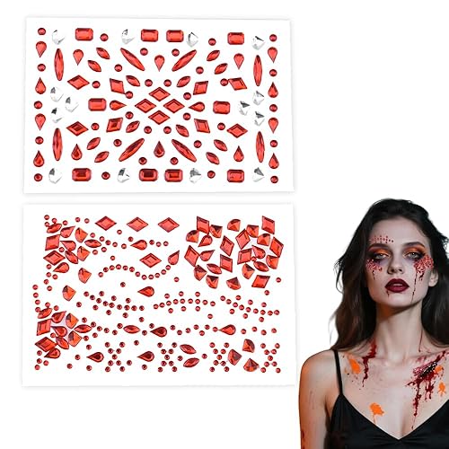 Face Gems Jewels Tattoos for Halloween: The red sticker gems for face can simulate terrifying effects such as dripping blood and scars, the rhinestone face gems can be used alone to embellish the eye or temple, adding a delicate touch, halloween makeup face stickers can also be applied over a large area to create exaggerated stage makeup effects, whether it's a cute cosplay style or a Halloween horror makeup, this set of halloween face gems jewels can be easily controlled