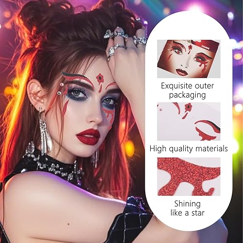 Unique Design: This face sticker features classic Halloween elements in its design. The sticker features red tears, spider webs, and red spiders as design features, and adds small sequins to make it look sparkling