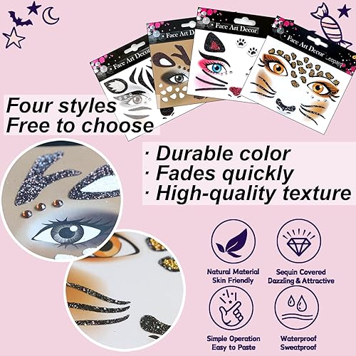Package: Receive 4 unique glitter tattoo sheets featuring dazzling Leopard, Cat, Elk and Zebras. Perfect for creating show-stopping Halloween makeup or enhancing cosplay looks in seconds