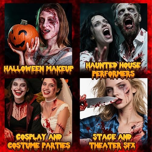 SPLATTER DRIPS CLOTS: Press the spray for micro blood splatter; pour liquid blood for natural runs/ooze; dab coagulated gel to build clots, scabs, gashes and dark edges. Layer textures for pro gore makeup—perfect for slasher looks, injuries, cuts, stitches, bullet holes and realistic bleeding effects on face & body.