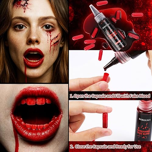INSTANT WOUNDS & TOOLS: Apply the water-transfer scar/wound tattoos in seconds, then blend with gel for depth. Tap the stipple sponge to create scrapes, road-rash, dried blood and pores. Use blood capsules for dramatic mouth blood / spit blood effects (spit out—do not swallow). Great for haunted house actors and film/photo shoots.