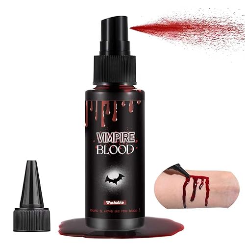 Easy Application & Washable Formula: Designed for hassle-free use. Spray directly onto skin, face, clothing, or surfaces – it flows and dries like real blood. Washes off easily with makeup remover soap and warm water. Removes readily from skin with tissue/cotton first, minimizing mess. (Note: May stain some fabrics - test first).