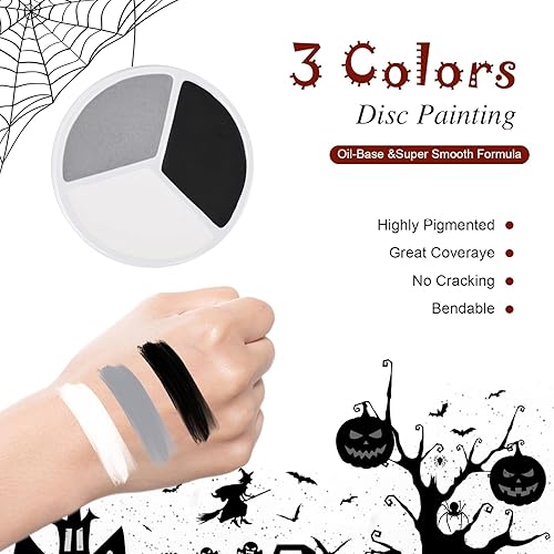 √ Black White Gray Face Paint: Halloween face painting kit comes with 3 intensive pigmented colors that applies easily with sponge and brush. Sponge could make blending, fading and smoothing effortless.