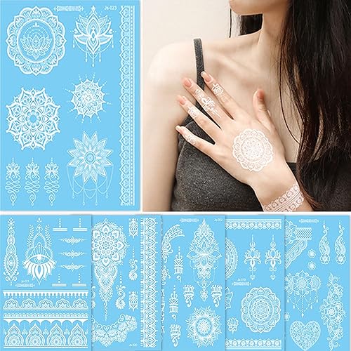 Henna Temporary Tattoos Stickers Blue Luminous Tattoo Stickers Lace Glow In The Dark Tattoo Sticker Lotus Flower Tattoo Art Sticker for Girl Women Party Arm Body Accessories 6sheets (Luminous)(White)