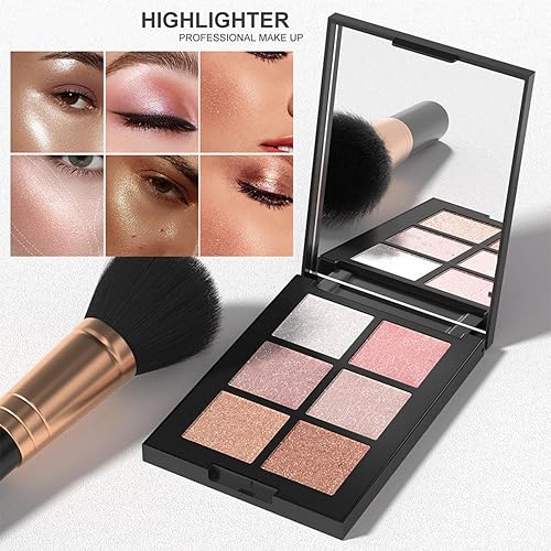 Highlighter Powder Palette, Highlighter Professional Makeup 6 Colors Shimmer for Face, Body & Eye, Long Lasting, Waterproof, Natural Glow Finish for Contouring and Highlighting with Mirror