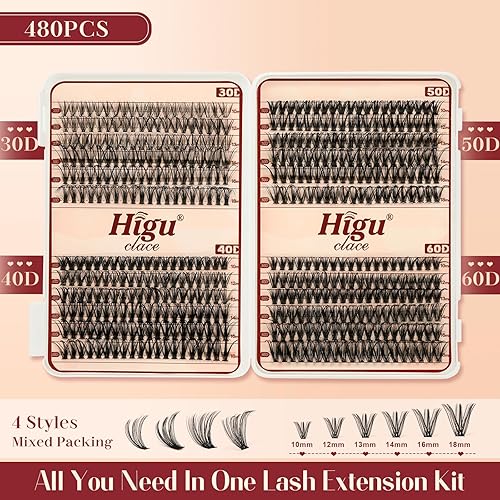 Higu clace Eyelash Clusters 600pcs 30D+40D+50D+60D+80D+100D Lash Clusters 6 Styles Mixed 10-18MM, Wispy Cluster Eyelash Extensions, Easy to Use, Can DIY at Home(30D+40D+50D+60D,1-480PCS)