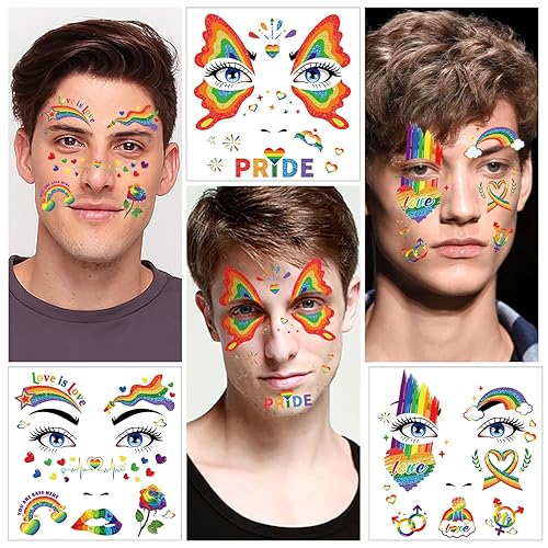 Safe & Waterproof & Long-lasting: Gay Pride Month Decorations face tattoos made of highest quality adhesive tattoo ink, safe and mild for human's skin, kids and adults can use with confidence! High quality gay pride body face art tattoos, rainbow glitter face tattoos can last for several days, keep long time Pride Equality Look!