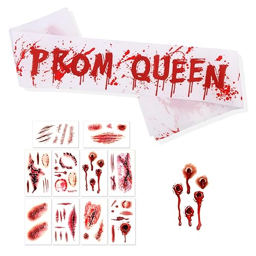 【Complete Zombie Prom Queen Kit】 Includes 1 premium bloody "PROM QUEEN" sash with sewn ends + 10 realistic scar tattoos featuring dripping blood effects, fake wounds, and gruesome cuts. Everything needed to transform into the undead belle of the ball!