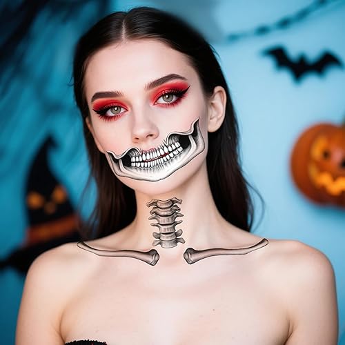Skeleton Face Tattoos: You will get 4pcs of Skeleton temporary tattoo stickers features chilling designs including skull face tattoos, skeleton tattoos, snake collarbone tattoos, and more. Our Skeleton Face Stickers are most suitable for Day Of The Dead and Halloween.