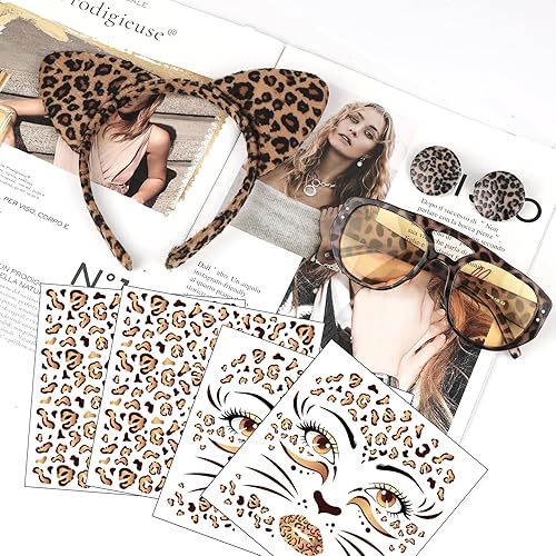 5pcs Halloween Leopard Costume Accessories: Package include 1pcs leopard ears headband + 2pcs leopard face tattoos + 2pcs leopard prints temporary tattoos stickers; perfect for elevating your women's cat, cheetah, or leopard costume on Halloween costume parties / Halloween cosplay parties.
