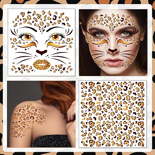 Easy to Applied and Remove: Our Halloween cheetah stickers for face/ leopard stickers for face can be easily applied on skin within 10-20 seconds by simply wiping with water and can be cleaned off by alcohol, body oil, olive oil, no pain and you can change the tattoo patterns at any time!