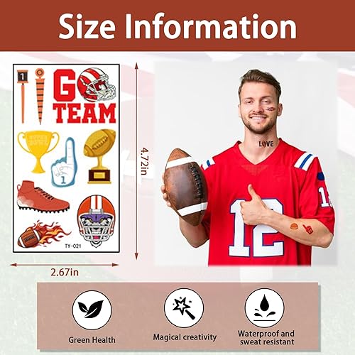 Size and Package: The size of the football tattoos is 2.6 inches x 4.7 inches / 6.6 x 11.9 cm; The package contains 10 sheets fun temporary tattoos, enough quantity and different designs for you to choose from