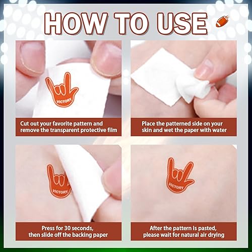Easy to Use: The football touch down tattoos stickers are very simple and convenient to use; Choose the desired pattern, wet with water, within 10-20 seconds can be easily attached, tattoos can be maintained for 2-5 days; with alcohol, shower gel, olive oil can be easily removed