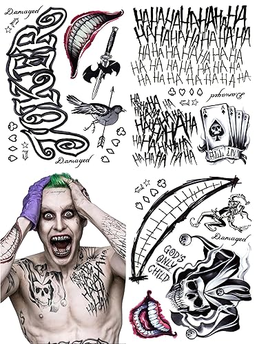 Pretty Realistic Makeup Tattoos:HQ tattoo set—complete with "Daddy’s Lil Monster" ,a heart-shaped tattoo with the word "ROTTEN",a red-and-black cartoonish design with a jester hat & heart, Joker’s Smile,etc. No cheap knock-offs here - Cosplay like a pro, as seen in fan films. You don't need to have great makeup skills, tattoos are easy to use, and you can complete the perfect role play in seconds.