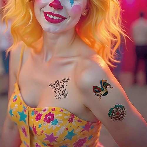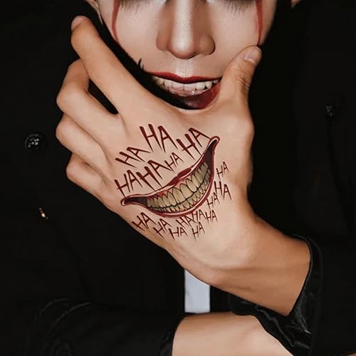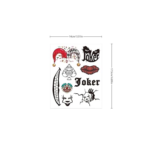 ✿【Packing Include】Clown tattoos a pack, including 6 sheets realistic fake joker tattoos(5.5x6.89 inch), scars tattoos. You can be applied to various parts of the body, such as the face, arms, legs, shoulder, wrist, chest, hip or anywhere you like.