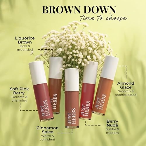 Just Herbs Ayurvedic Liquid Matte Lipstick Kit Set Of 5 With Long Lasting, Hydrating & Lightweight Lip Colour, Nudes & Browns - Paraben & Silicon Free - 5 Ml