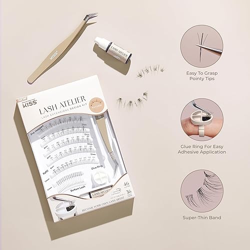 KISS Lash Atelier Professional Lash Extension Kit, ‘Natural’, Pre-Mapped False Eyelashes, 46 Lash Clusters & 36 Individual Lashes, Last For Up To 7 Days, Glue Ring, Applicator(12mm-14mm,Anime)
