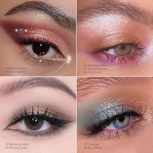 【Buildable Glossy Colors】Champagne base with ultra-fine white or silver pearl mica, smoky shimmer brown high flash tone, and bright cyan blue, pink and peach sparkling tones, to create an advanced super glossy eyeshadow effect, blend them gently to create flawless eyes makeup.