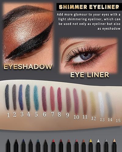 Different Eye Makeup Effects - The eyeliner pencils include both shimmer and matte series, 15 different colors can be freely matched with all occasions of makeup, whether it is daily work or festival stage, you can make full use of it. Especially for Halloween and Christmas, you can boldly match all the colors to attract everyone's attention. White and nude eyeliners are also perfect for outlining the inner eye line.