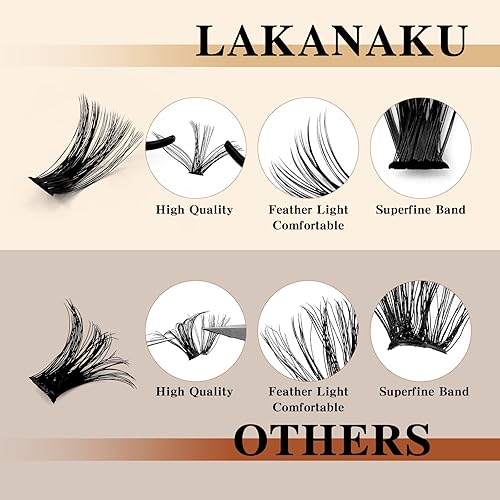 【Suitable to wear】LAKANAKU wispy lash clusters have thin and superfine band, lightweight and soft lashes that after wearing it you can hardly feel the fluffy lash clusters and it doesn't block your vision. When you blink, the lash band won't sting your eyelid area, and it's comfortable to wear all day long and easy to use even for beginner lash users.