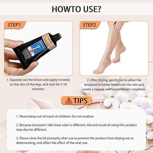 【Usage steps】STEP1:Squeeze out the lotion and apply it evenlyon the skin of the legs, and wait for 5-10 minutes; STEP2:After drying, gently pat to allow theemulsion to better blend into the skin and create a natural and beautiful skin condition