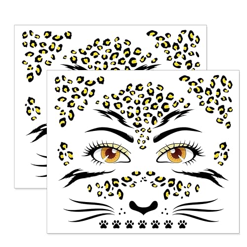 Leopard Face Tatto Halloween Costume Realistic Cheetah Designs Fake Temporary Full Face Tattoo Stickers Leopard Frint Face Tattoo 2-Sheet(Cheetah B)