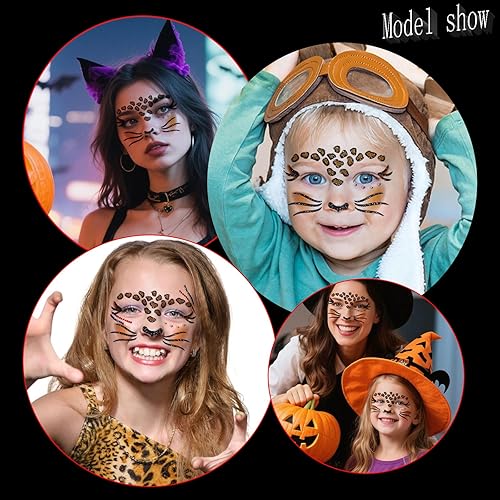 Halloween Tattoo Stickers Decal:This Cosplay temporary tattoos contains 2 identical leopard print temporary face tattoo stickers, each with a size of approximately 5 x 4.7 inches, suitable for both adults and children, and can be freely adjusted according to your own face shape.