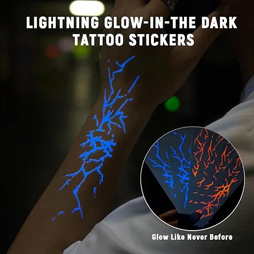 Long - Lasting Glow Effect: Step into the spotlight!These glow in the dark body stickers can glow brightly in the dark for an extended period. Whether you're at a dimly lit party or under the night sky, they'll make you stand out and shine. Our lightning tattoos glow automatically under UV or black light, making you the center of attention at parties, festivals, raves, and night outings