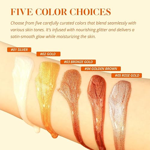 Five kinds of color choice:Choose from five carefully curated colors that blend seamlessly with various skin tones. This hydrating shimmer body oil, infused with nourishing glitter, delivers a satin-smooth glow while moisturizing skin