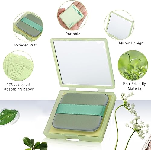 MA..YCR.EATE/ 100Pcs Face Blotting Paper for Oily Skin, Oil Blotting Sheets for Face, Natural Linen Oil Paper for Face, Blotting Paper for Makeup, Built-in Mirror & Powder Puff for Women Men Green Tea