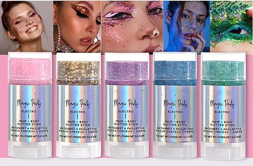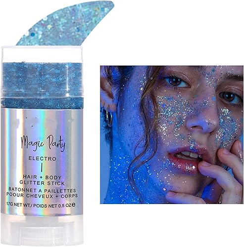 ✨【Body Glitter Gel Stick】The face glitter stick has shimmery and beautiful color with thick glitter, a little goes a long way with great shimmer shine. The color and shine vary in different angles, is great for body glitter, face glitter makeup and glitter hair accessories, delivers super vibrant and sparkling effect, looks amazing once it hits the light.