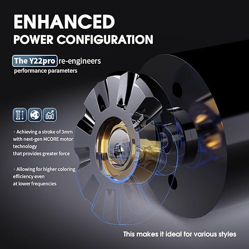 Information: Weighing just 126 g and measuring 146 mm in length with a 26 mm grip, the Y22 Pro is designed for comfort and control; its 3 mm stroke and 12V/10000rpm motor speed ensure reliable performance across various tattooing techniques