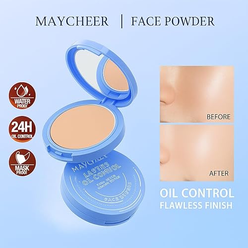 Oil Control & Pore-Blurring Matte : Achieve a shine-free complexion with our oil control matte flawless face powder. This Maycheer pressed powder compact actively absorbs excess oil throughout the day, minimizing the appearance of pores and delivering a pure, velvety matte finish. It's your secret weapon against unwanted shine.