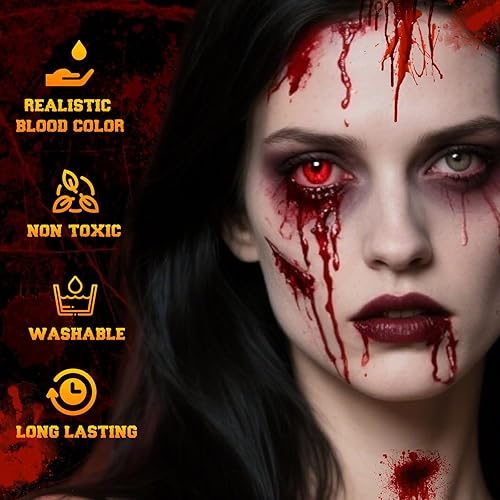 Versatile Application for Multiple Looks: Perfect for a wide range of scenarios, from haunted house attractions to film production. This fake blood is easy to apply and versatile enough to be used on the face, body, or even props. Create everything from subtle blood splatters to gruesome, dripping wounds with ease, making it an essential tool in your special effects makeup accessories.