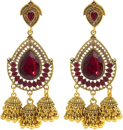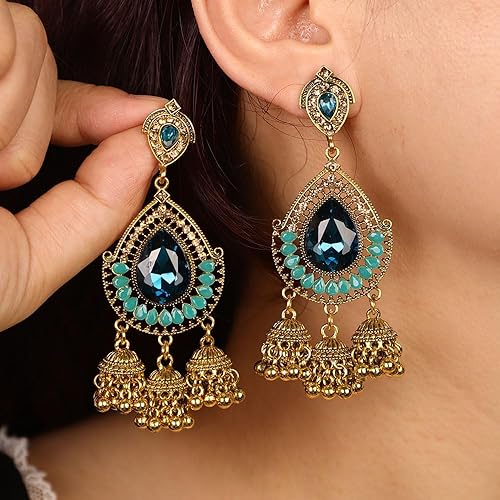 Missgrace Bohemian Indian Red Blue Rhinestone Dangle Teardrop Tassel Long Earrings for Women Vintage Retro Chandelier Earrings Beaded Crystal Jhumka Jhumki Tassel Studs Traditional Earrings for Women(Blue)