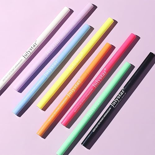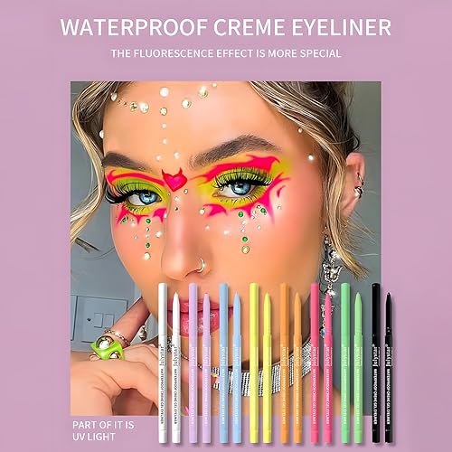 【8 Colors Rainbow Eyeliner Set】 8 Colors UV Neon Eyeliner Set has a matte finish and UV luminous finish to help create a bright everyday look and a glamorous nighttime look. Indoors or outdoors, day or night, these neon eyeliners will make you stand out under UV light!