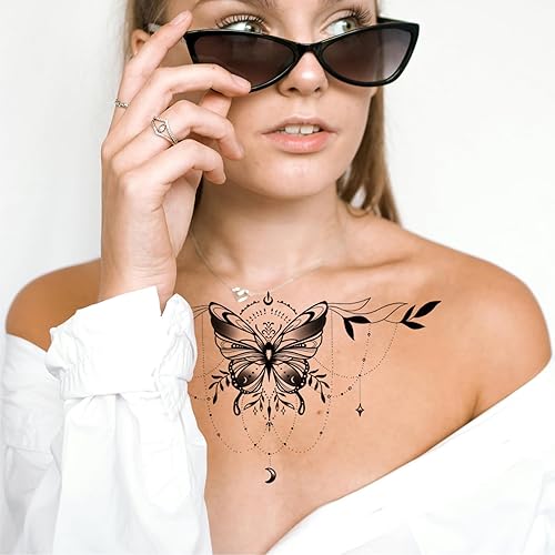 LONG LASTING TEMPORARY TATTOOS - Large black semi permanent chest tattoo for women girls waterproof and lasts long for 3-7 days. Remove clear film, apply fake tattos on clean dry skin, dab tattoo with damp paper towel. Remove paper, let temp tattoo dry. It's that simple!