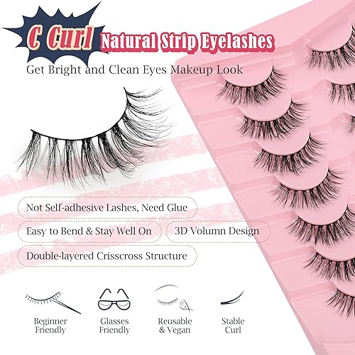 Natural Lashes Eyelashes Wispy 12mm False Lashes Soft Strip Lashes 3D Volume Eyelashes Thin Cotton Band Natural Eye Lashes C Curl Eyelash Siligli Lash Pack 7 Pair(Pure Wispy D-396)