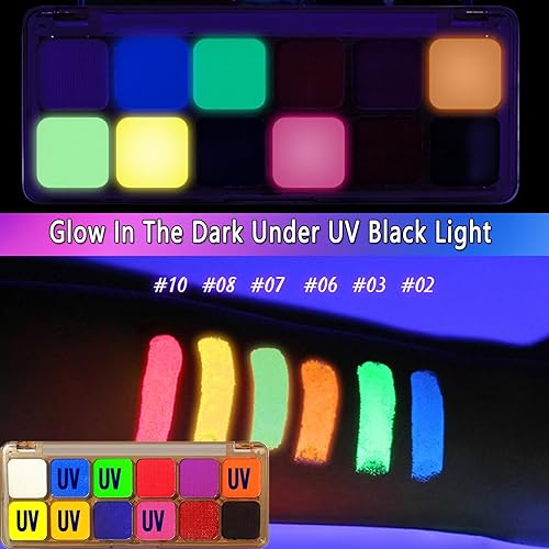 【Glow Under UV Blacklight Face Paint】The face paint is a bright neon colour in natural light and glows brightly under UV black light. It can be fulfilled to create endless imaginations and make you stand out from the crowd.An event of unmatched beauty and fun, it's the pinnacle of your party flair.Warm Tips: Glow under UV Blacklights, not glow in the dark.