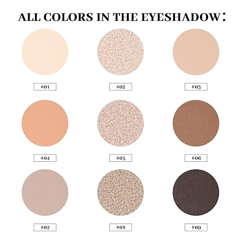 【Professional Neutral Palette】 This nude eyeshadow palette features 9 versatile shades (matte, shimmer, and metallic eyeshadow ) perfect for creating natural eye shadow looks. It includes taupe, dark brown, and soft neutral eyeshadows, perfect for everyday eye makeup