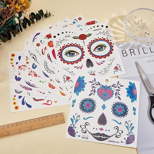 Package: You will get 12 sheets 6.23 x 6.23 inch / 16 x 16 cm in many styles designs day of the dead skeleton face temporary tattoo face kit, black white blue pink brown gold silver fluorescence multicolor apply in to create more interesting experiences