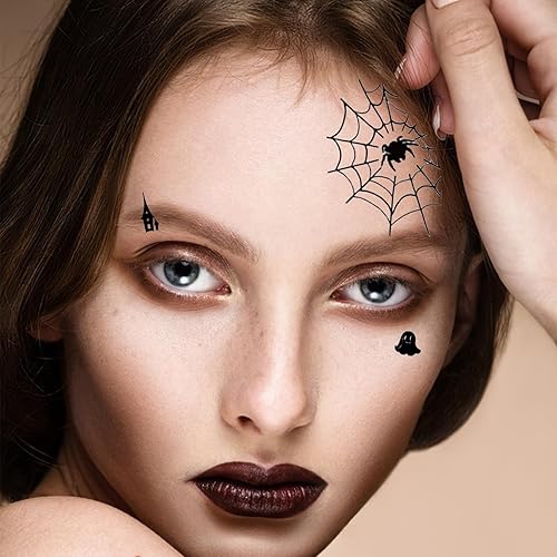 9 Sheets Halloween Spider Web Temporary Tattoos: realistic spider face tattoos for adults, women, and kids offer lifelike body art. Includes large scary spiderweb, bat, and cobweb styles for Halloween makeup.