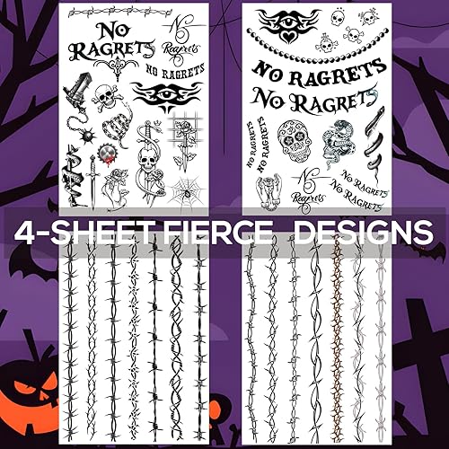 VIBRANT DESIGNS::-- Features 4 premium sheets with Halloween-themed tattoos including edgy "No Ragrets" text, gothic skull tattoos, realistic snake designs, and barbed wire spine tattoos for wicked body decorations.