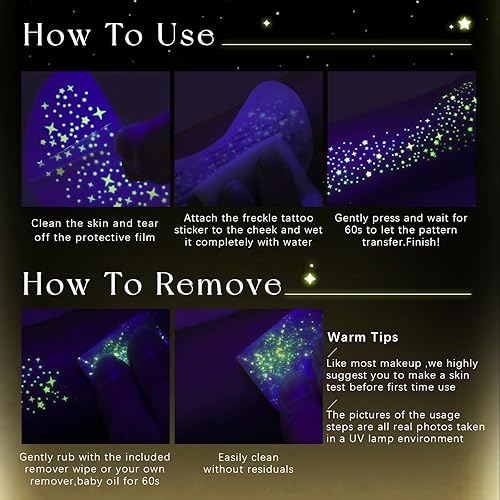 Easy to Use: Put the tattoo sticker on the cheek and wet it completely with water or wet tissue, press for a while and peel it off, a nice glitter freckle makeup is finished. Under normal light, it shows a normal yellow gold color. When you go to party, bar, anywhere has UV lighting, it shows a shinning glow. Wiping the included remover cotton, baby oil or your own remover can clean it off, never worry about residual