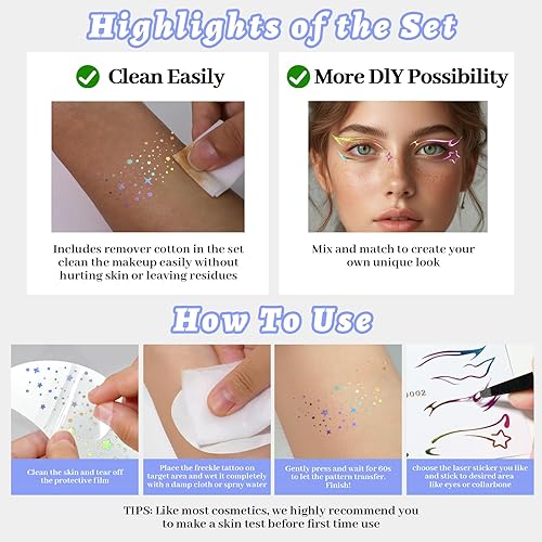 Sparkling and Glowing: There are 6 sheets of holographic freckles tattoo sticker, 2 sheets of iridescent eye stickers and 6pcs remover cotton in the set. The glitter freckle patches are made of shinning holographic silver foil technique, giving you a stunning latest makeup style. It reflects colorful luster in different angle of view, adding a unique charm on your cheek. Pair up the freckle and eye sticker, make your makeup style so attractive