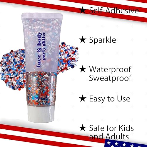 【Easy-to-Apply & Self-Adhesive】Skip the glue!This self-adhesive glitter gel makes applying Fourth of July accessories effortless - just swipe on with fingers or a brush for instant sparkle on face,body,hair,as American flag accessories for a bold statement.