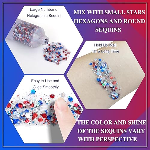 【Versatile & Long-Lasting Shine】From face to collarbones,shoulders,or as 4th of July hair accessories,this body glitter adds a sparkling effect to elevate your makeup look.Great red white and blue accessories for a patriotic touch.Stays put all day yet washes off easily with soap and water - no stains!