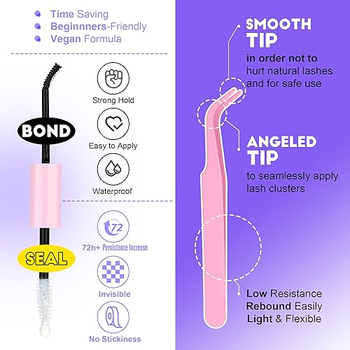 Easy-Application Tips: Gentlely roll the lash band down with tweezers; Apply lash bond; Place the lash clusters; Use lash seal brush to lock