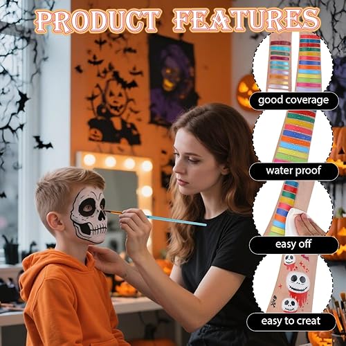 [EASY TO USE AND WASH OFF] This kit comes with oil based pigment. Bright facepaints are easy to apply smoothly and give great coverage. The high-quality formula ensures that vibrant colors easy to apply and won't fade or smudge. When the fun is over, the washable face paint effortlessly comes off with mild soap and water or wet wipes.