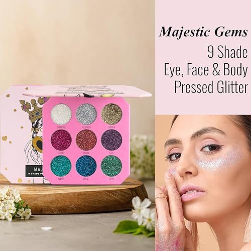 Profusion Cosmetics Majestic Gems 9 Shades Pressed Glitter Palette - High-Impact Sparkle for Face, Body & Eyes, Buildable & Blendable with Minimal Fallout Application, Cruelty-Free Makeup